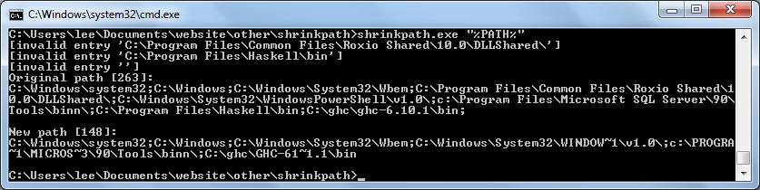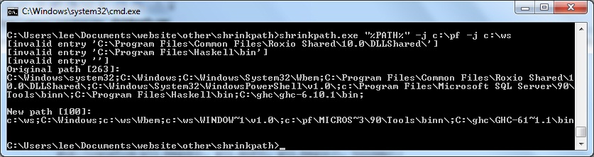 A nice way to shrink paths is to use junctions - if you have a junction you want shrinkpath to use, specify "-j junc" (as many as you want). Eg here I've junctioned c:\pf -> "c:\program files", and c:\ws -> "c:\windows\system32"